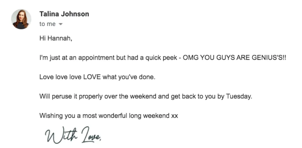 Talina couldn’t wait to send her love — even mid-appointment — after seeing her brand for the first time